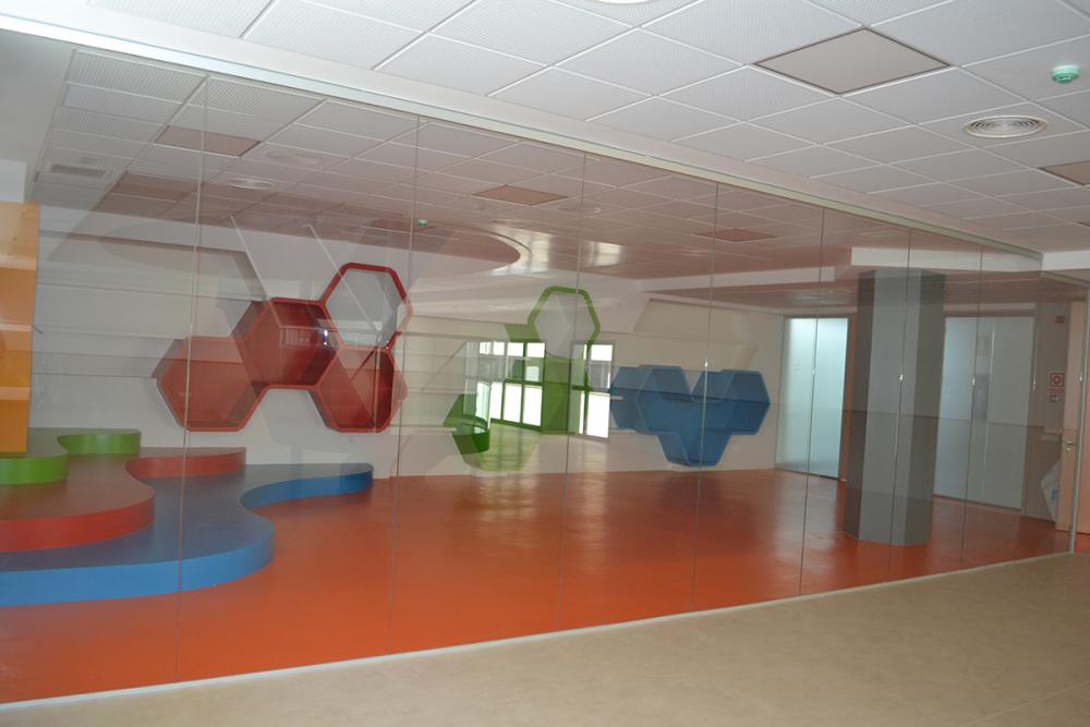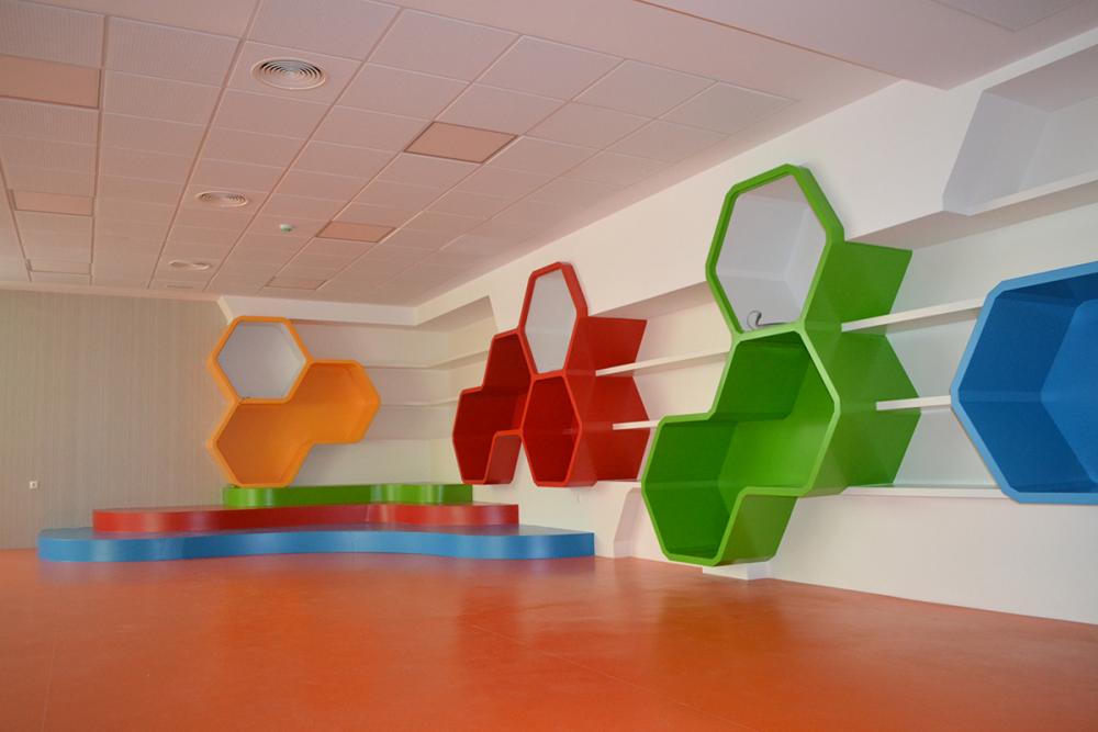 Biblioteca Infantil modular con diseño geométrico .Realizada en estructura de D.M y lacada.